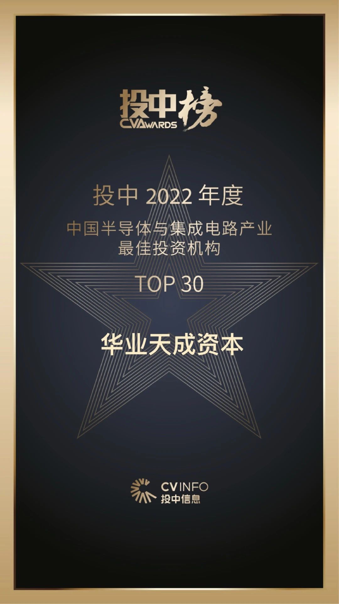 日前,投中信息重磅发布2022年度系列榜单,华业天成资本荣获多个奖项:『投中2022 年度中国最佳创业投资机构TOP100』『投中 2022 年度中国半导体与集成电路产业最佳投资机构TOP30』『投中 2022 年度中国人工智能与大数据产业最佳投资机构TOP20』华业天成资本自2015年成立以来,已连续2年获得中国最佳创投机构百强,并作为百强榜单中极少有的垂直类机构上榜。华业天成聚焦信息科技领域,历时8年,所投项目70%获得头部产业方及知名投资机构后续轮融资加持,超过1/3成长为独角兽或准独角兽,超过11家计划明年内IPO,被行业称为“隐秘狙击手”。华业天成All in第三代信息技术,洞察自1970年(第一代信息技术)以来技术变革的核心动能和轮动效应,并坚持投早、投准的投资策略,捕捉基于半导体、基础设施(智慧算力)、智能终端、智能应用四层投资机会。结合对技术变革和产业趋势的深刻洞见,华业天成陆续在半导体、智能终端、云与数字化等赛道布局了一批细分领域的领先企业。本次榜单除主榜外,华业天成还分别获得,2022 年度中国半导体与集成电路产业最佳投资机构TOP30和2022 年度中国人工智能与大数据产业最佳投资机构TOP20。得益于华业天成资本在信息技术领域多年的精耕细作,对优质前景赛道如半导体、智能终端、智能应用等前置布局,发掘并成就了一批高潜力价值的优秀企业,如英诺赛科、伏达半导体、聚芯微电子、科杰科技、珂玛材料、汉朔科技、乐动机器人等。华业天成坚定的相信未来二十年是中国科技企业群体崛起的黄金年代,“第三代信息科技以来,数字世界会第一次进化出类似人类大脑皮层的高级智能,人类历史上将第一次出现实体世界的数字孪生世界”,华业天成创始人孙业林根本性的定义了第三代信息科技的未来图景,并认为大模型将颠覆性的带来智能物件市场的爆发,和中国软件市场的重构。未来,华业天成将持续自我更新、坚持长期主义,为客户创造长期稳健的收益,并支持这个世界的“创造力”,做时代潮流中贡献者。