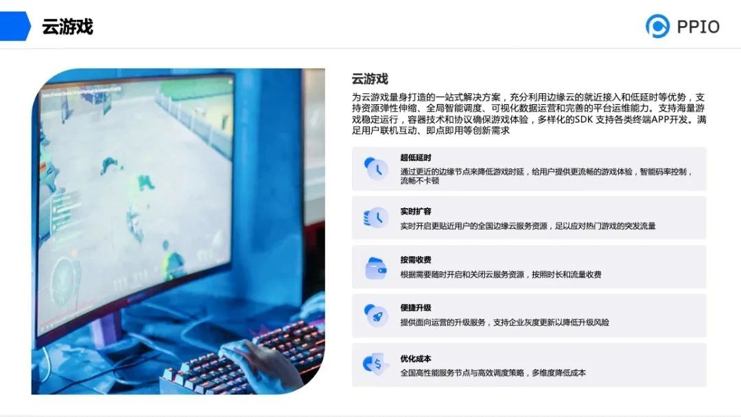 报告显示,2022上半年,中国边缘云市场规模总计30.7亿元人民币,同比增长达到50.8%;其中,边缘公有云服务、边缘专属云服务、边缘云解决方案市场规模分别达到17.1、4.4和9.2亿元人民币。根据最新预测,2021-2026年边缘云市场年均复合增长率达到40%以上,除了基于边缘云资源的传输与分发体系,越来越多边云协同场景的出现、以及传统行业用户对“即服务”模式接收程度的提高,正在持续为市场注入活力。从成本降低到体验提升,再到业务革新,边缘云为用户带来了诸多便利与可能性,越来越多的客户正在构建起中心与边缘协同的分布式IT架构,基于广泛边缘节点资源,重构部分或全部IT功能,实现基于边缘的数据闭环。报告中还指出,在边缘公有云服务市场中,边缘容器、边缘函数计算、边缘视图计算、以及基于边缘云资源的安全服务等具备强劲的增长潜力。基于边缘资源的互联网音视频分发、云游戏方案部署、安防监控视频存储与视图计算等是本期的市场核心驱动力。PPIO云游戏解决方案