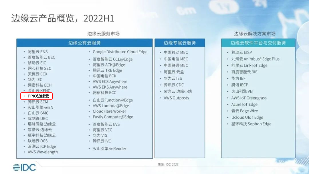近日,国际数据公司IDC最新发布的《中国边缘云市场跟踪研究,2022H1》报告中,华业天成A轮投资项目PPIO继续位列边缘计算行业前10,作为唯一的边缘公有云服务类创业公司市场份额增速领先。同期入选的还包括阿里云、百度智能云、移动云、天翼云、华为云等大型云厂商。